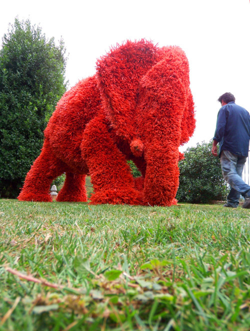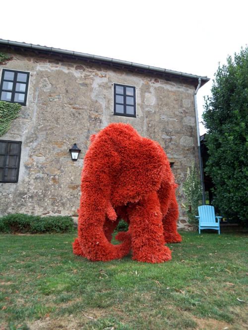 Con una estructura de malla metálica y 150 mil nudos de hilos de polipropileno, el escultor gallego Javier Requejo hizo está increíble escultura paquidérmica, la escultura tiene 3,20×1,40x2h metros, recrea un elefante naranja des contextualizado con su hábitat de origen.