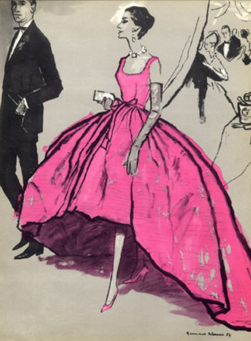Diseño del modisto español Cristóbal Balenciaga para un vestido de noche, ilustración por Bernard Blossac.