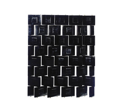 Esta pantalla de madera lacada se compone de varias hileras horizontales y verticales unidas por finas varillas de metal vertical.