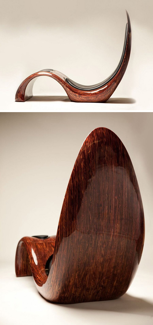 Sillón diseñado por Kyle Buckner, conocido por su uso de la madera a través de proyectos que van desde el diseño de muebles,al de automóviles, esculturas y dispositivos de Apple, utiliza la caoba con tapicería de cuero acolchada para mayor comodidad en este diseño ergonómico.