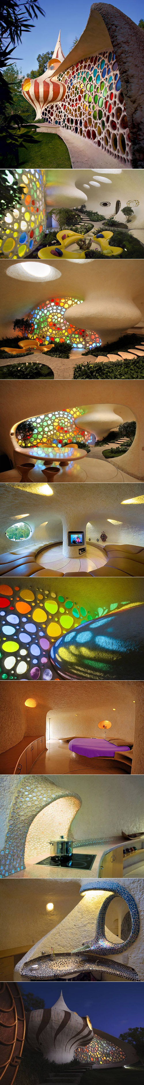 Me gusta mucho la decoración interior superficies lisas redondeadas, colores ricos, y zonas verdes por toda la casa y sobre todo la pared de cristales de colores.